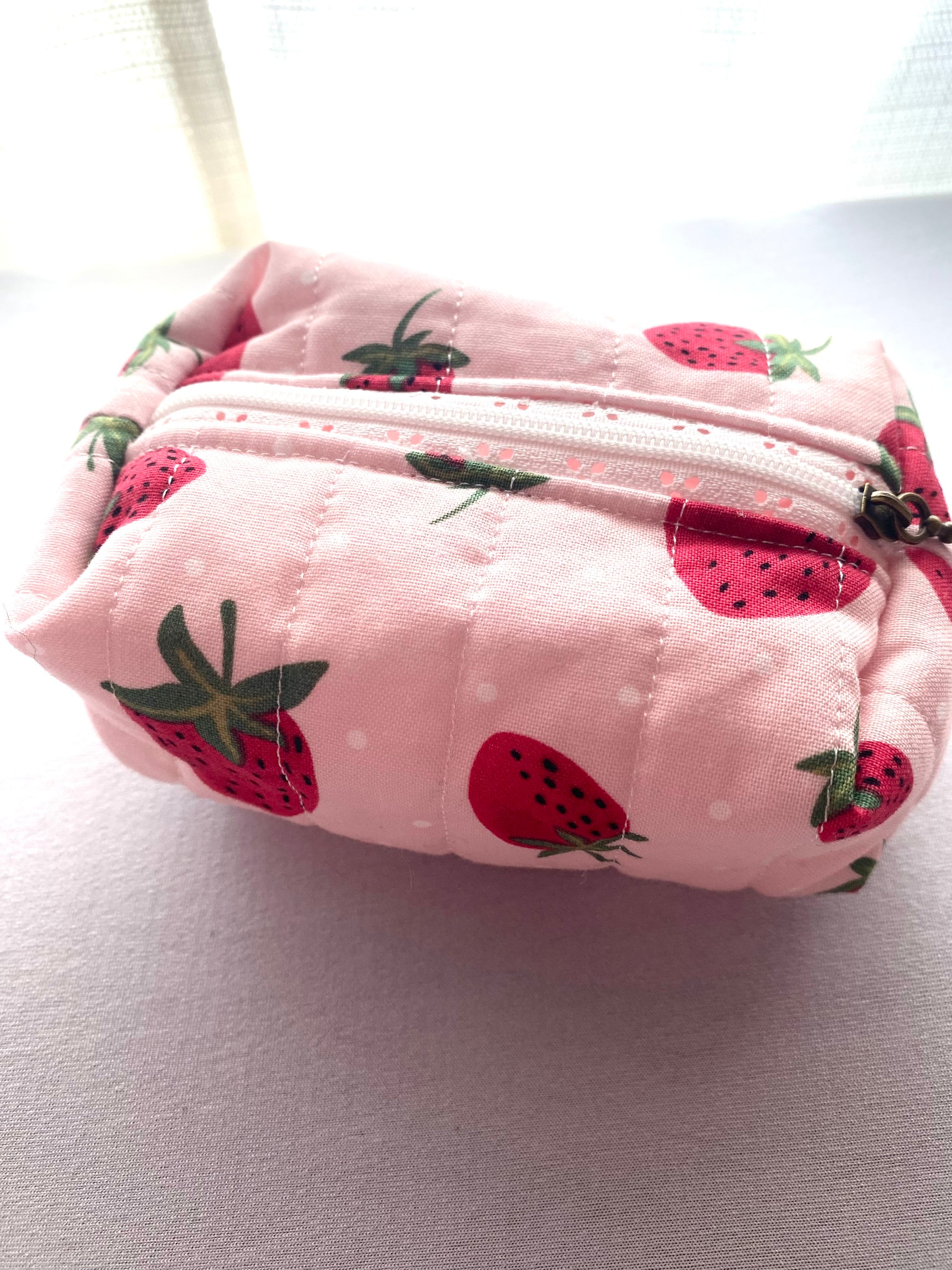 Our Strawberry Quilted Pouch is the perfect accessory for organizing and storing your items. Handmade with high-quality cotton, they offer a sturdy zipper for secure closure. Add makeup, toiletry items, pens, sunglasses, anything to make it fit your lifestyle!